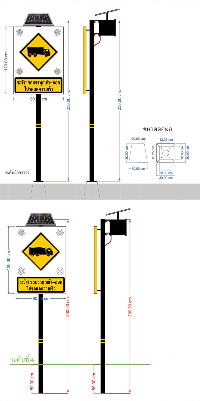 ป้ายเตือนระวังรถบรรทุก เข้า-ออก โปรดลดความเร็ว พลังงานแสงอาทิตย์