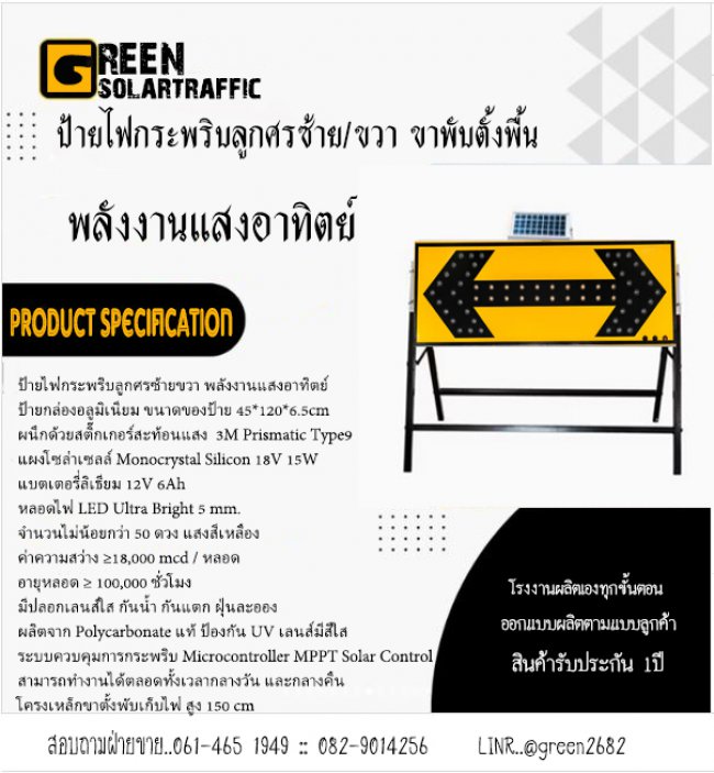 ป้ายไฟกระพริบเตือนลูกศรซ้ายขวา ขาพับตั้งพื้น พลังงานแสงอาทิตย์ ราคา : สอบถาม .- ประเภท : NEW PRODUCT ป้ายไฟกระพริบเตือนลูกศรซ้ายขวา ขาพับตั้งพื้น พลังงานแสงอาทิตย์